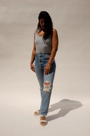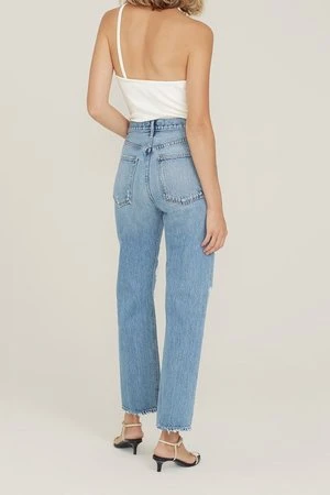 Agolde 90’s pinch waist in medium light blue wash with distressing. The perfect vintage inspired straight. Designed with a close-fitting high rise and easy, full-length straight leg. Button fly closure.