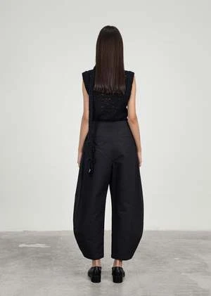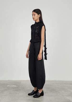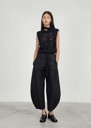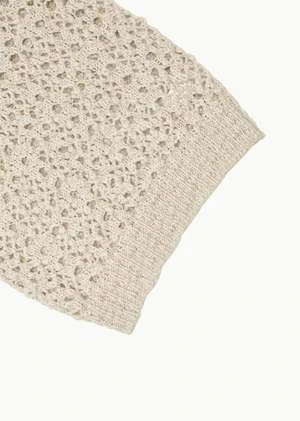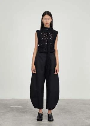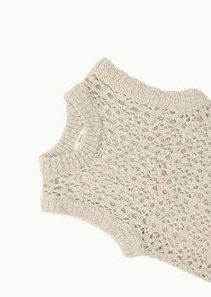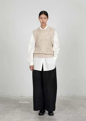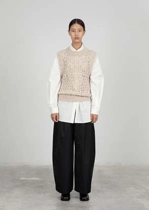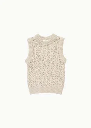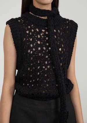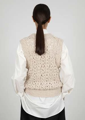Crochet vest from Amomento with an irregular texture, developed in-house for the FW23 season. Wide ribbed edges create a sharp frame to feature this nubby knit pattern. Wear alone or layered for styling versatility and extra warmth.