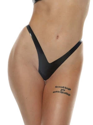 Simple latex thong that sits high on the waist and dips in the front and back.