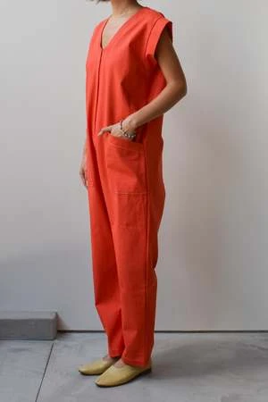 Sleeveless V-neck Jumper with side pockets and front zipper closure.