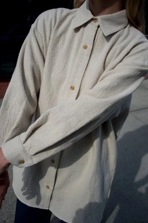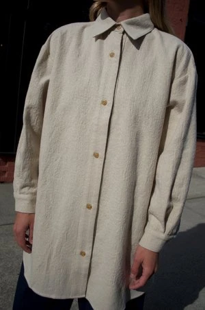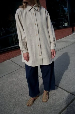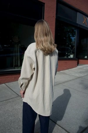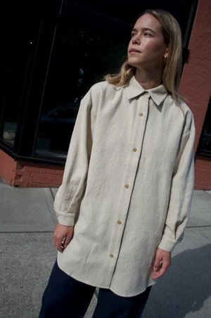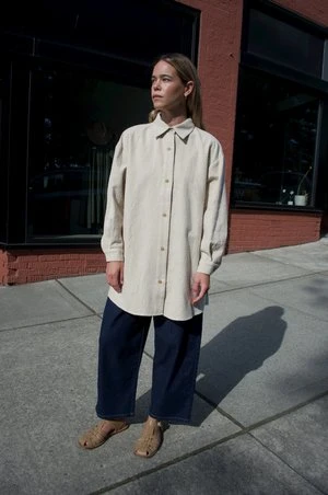 An Atelier Delphine favorite in this season’s washed wool. Midweight, lightly felted hand with a soft finish. Button closure, relaxed fit with graduated hem sitting below the hip. Can be worn as a top or shirt jacket.