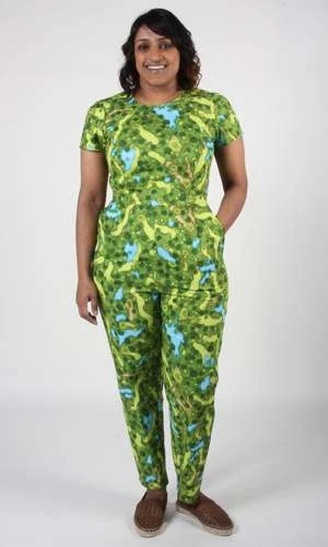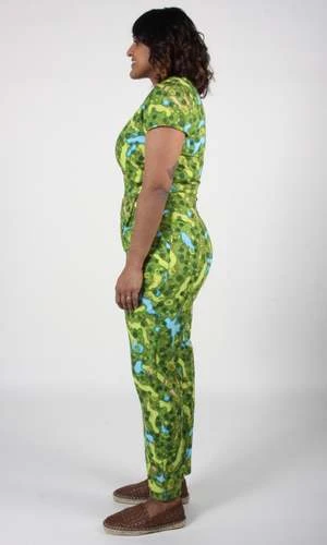 Auk is a fitted, flattering jumpsuit with front pockets, a short sleeve, and a back invisible zipper closure.