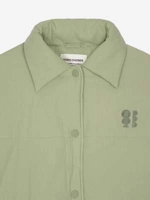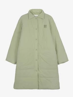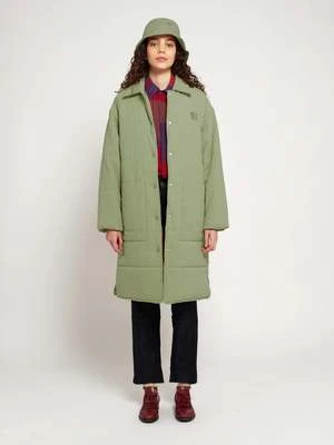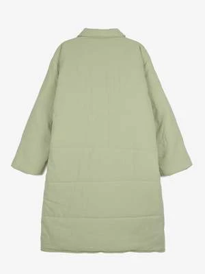 100% cotton olive outerwear. Designed with flat collar, embroidery, below knee length and quilted padded. Made in China.