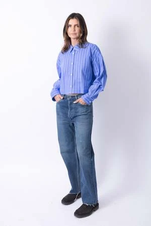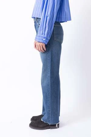 Subtly distressed and high waisted, this straight, medium wash denim pant includes raw-edge hems and soft fading at natural wear areas.