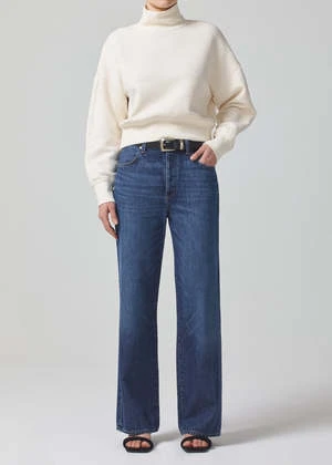 This trouser inspired silhouette is designed to sit high on the waist with a flattering, ultra-relaxed wide-leg. This easy-going staple offers a longer 33 length inseam. Style yours with a sleek bodysuit or a classic t-shirt and blazer. Fits true to size. Button fly closure. Chantry is a medium bright indigo wash.