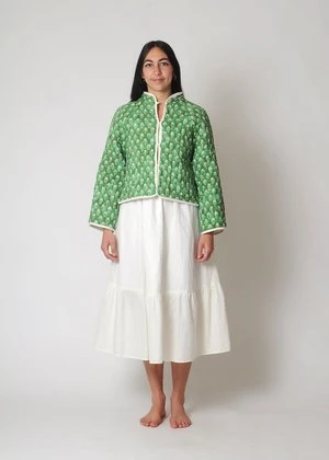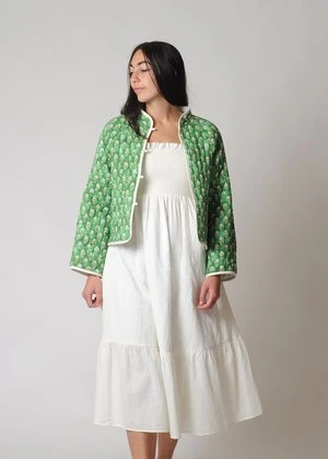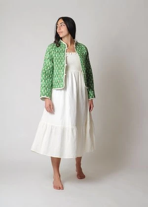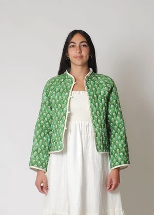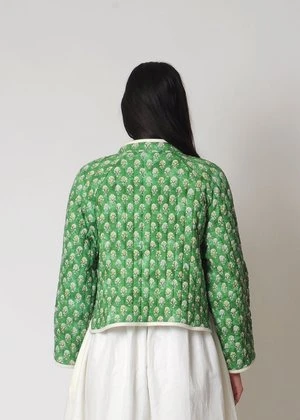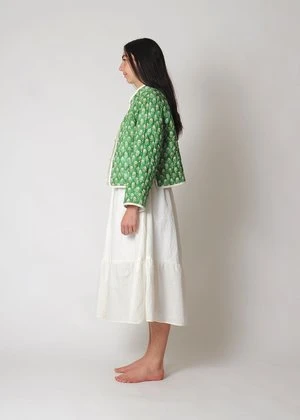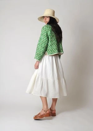 two jackets in one with a solid natural or green floral print option. this is my favorite spring and fall jacket ~ i test wore the sample all last year. Printed fabric is 100% cotton remnant and the solid soft black is 100% cotton gauze. two patch pockets. if in-between sizes, please size up