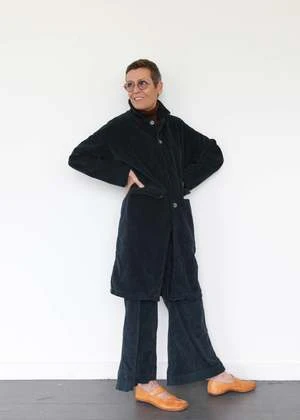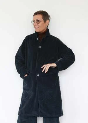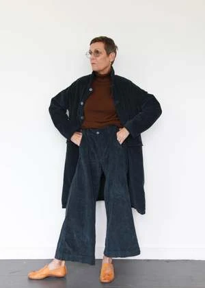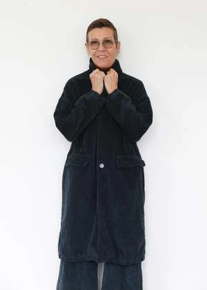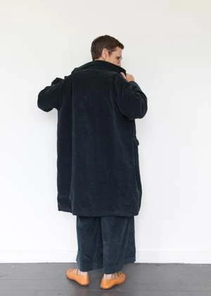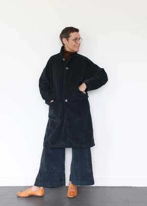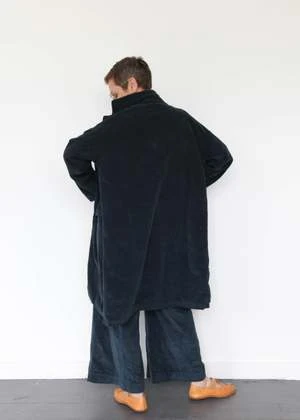 Fully lined cotton corduroy knee-length coat from CP Shades. Button placket hides all but 3 buttons at neck and waist, with a collar and pockets, what more could you ask for?