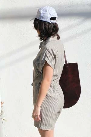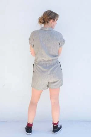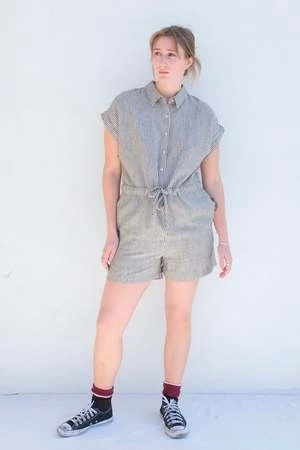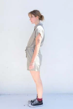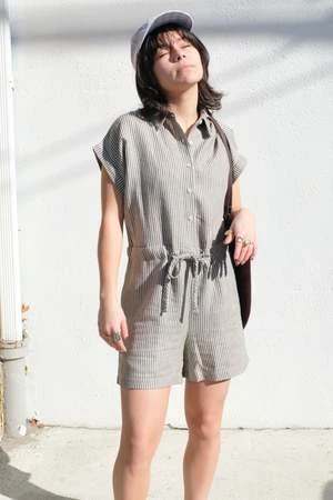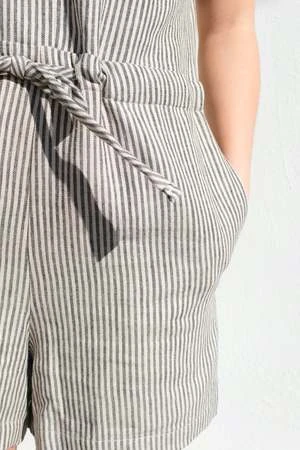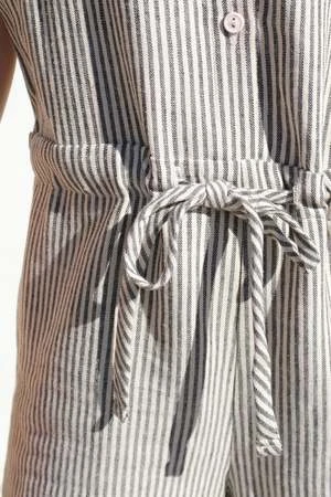 A short jumpsuit with short cuffed sleeves, hidden side pockets, front button placket and a drawstring at the waist. The vertical stripes gives the look of an elongated silhouette.