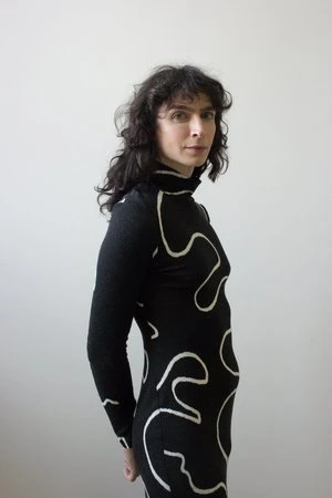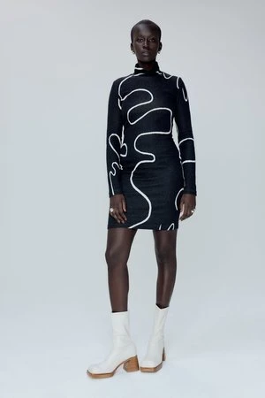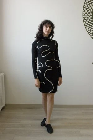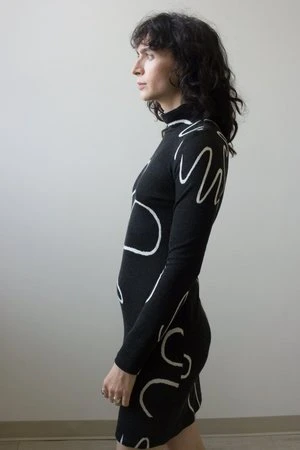 Eve Gravel’s Sedona Dress is sexy meets modest. This fitted bodycon dress is made from a stretchy blend of cotton and viscose. It has long sleeves, a turtleneck and mid-thigh hem, perfect for pairing with a pair of tall boots. The serpentine style pattern is a modern edgy design that elevates this dress from basic to fabulous.