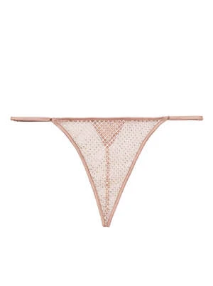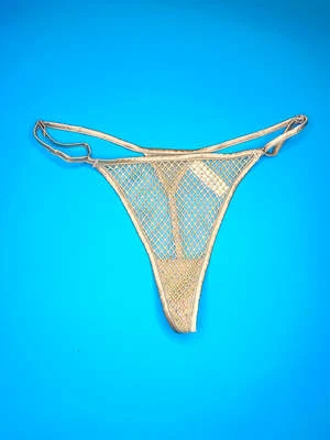 Shine like a superstar in this rhinestone covered mesh g-string. Delicate, adjustable silk side straps.
