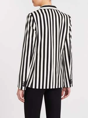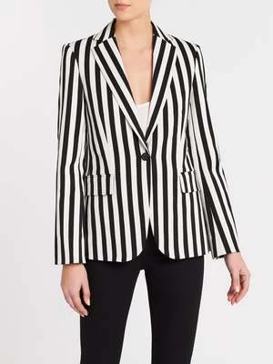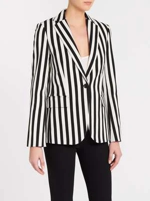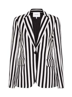 The Classic Blazer in Noir by Frame Denim is the perfect autumn layer piece. Crafted from an ultra soft cotton blend this statement blazer features bold noir stripes accentuating this classic silhouette with a peaked lapel collar, center back vent and is finished with a single button fastening. Layer over a crisp button down and leather look denim for a modern muse inspired weekend look.