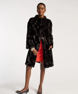 Be your own muse with the Dame Coat. Wrapped in luxurious faux fur, this straight-cut design sits just above the knee – complete with a standing collar, snap front closure, bracelet-length sleeves, side seam pockets and emerald green lining. Throw this timeless layer over any dress or jeans for a consistently sleek look. Faux fur coat Lined Front button closure Pockets Imported