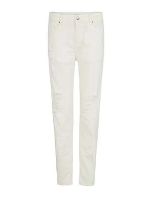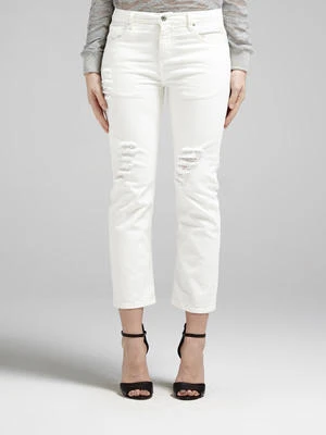 The IRO Jeans Navrick Jean is a soft creamy white denim boyfriend cut with an ankle crop and shred detailing across the thighs and knees. Wear them loose and low with your favourite kicks or a pair of killer heels. Classic 5 pocket styling with a low slung waist and silver hardware.