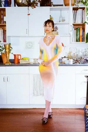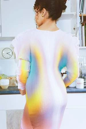Long sleeve midi dress in baby pink with a sunset gradient of hues of orange, yellow, and green blending into one another. The Sander Dress captivates through hand-pleated texture and silhouette a high neck toward puff shoulders, twisted sleeves elongated into the rest of the straight shaped bottom, and a back off-center slit for movement. This dress is reservable and features a deep V open slit with a string tie closure around the neckline.
