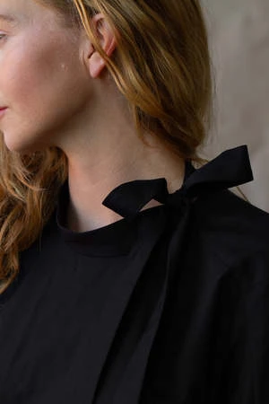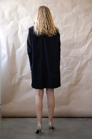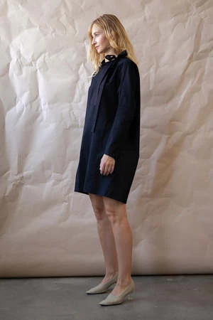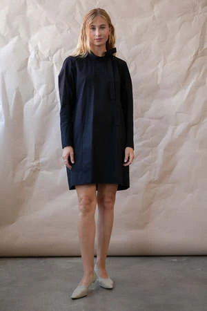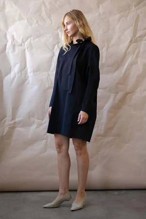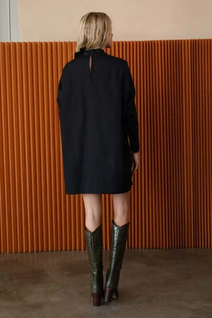 Mod 60s vibe mini dress with mock neck and ties at left shoulder, exaggerated forward shoulder and darts for shaping instead of a traditional arm hole; slim sleeves with architectural detail at underarm for easy range of movement. Front is fully lined, extra swing in the back. Slips on with hook and eye closure at back neck vent.