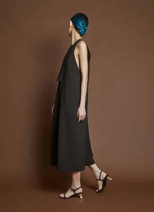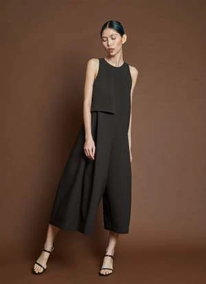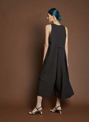 Elegantly draped onesie with a pleated detail on the side, meeting at one side pocket tucked underneath the top layer. Features a round neck, dropped armholes, wide pant opening, and an invisible zipper back. This jumpsuit fits relaxed. Can be layered over a long-sleeve turtleneck or a camisole. Center back seam for a flattering silhouette.