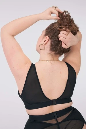 The Ramble On Bra features a sheer support with a scoop neck front and deep V in the back.