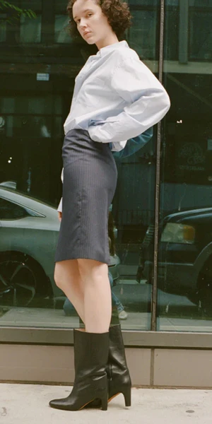 This Density Skirt from Maryam Nassir Zadeh features a modern pencil cut, knee length and high waisted design. A subtle pinstripe detail and slit at the back adds style and movement to this skirt to create a contemporary look.