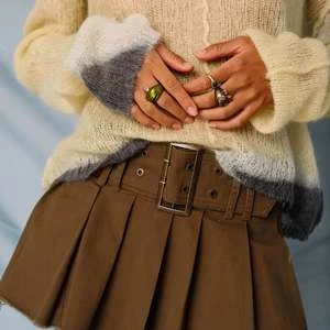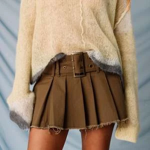 Low rise pleated skirt. Attached belt. Frayed hems. The classic form and details of this khaki mini-skirt are perfect for any occasion. The low-rise design, pleated skirt, attached belt, and frayed hems provide a timeless look for any wardrobe.