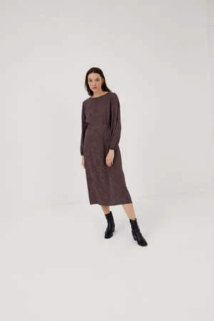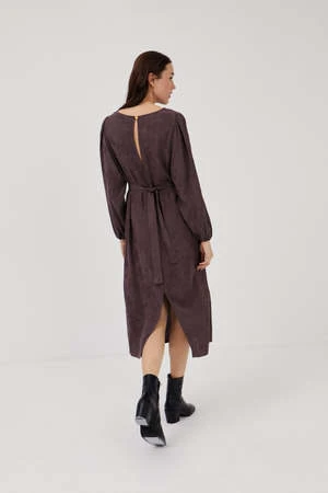 Stylish and perfect for a special occasion, the Alanis dress features a boat neckline, tear-shaped opening at the back, and billowy cuffs. Multi-position belt made from the same fabric. Special golden button detail at the back neckline.