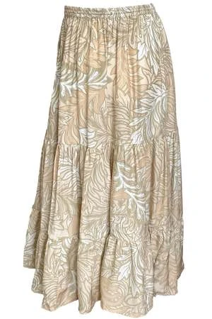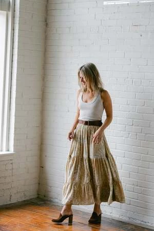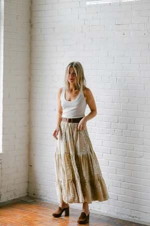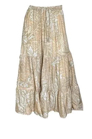 This skirt by Natalie Martin features a full, tiered maxi skirt with elastic and drawstring waist.