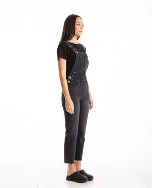 Noella Overall in faded zinc by Paige. This classic one-piece is cut from super soft denim with a hint of stretch in a faded black wash with a raw hem.