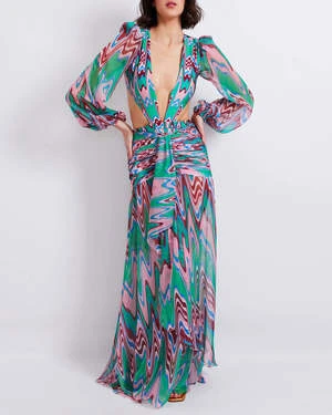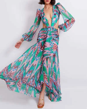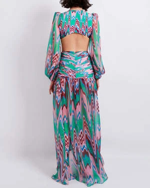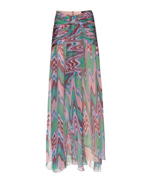 The Wave High Waist Drape Maxi Skirt in Green Multi by PatBo is a draped skirt featuring a medium-rise and ruched hips crafted in a printed chiffon fabric.