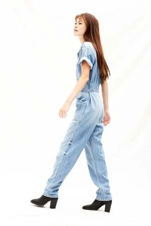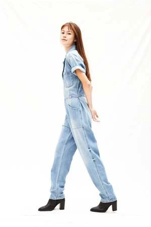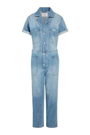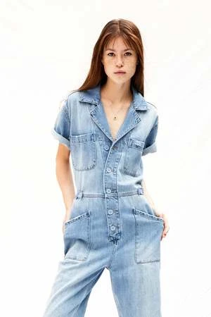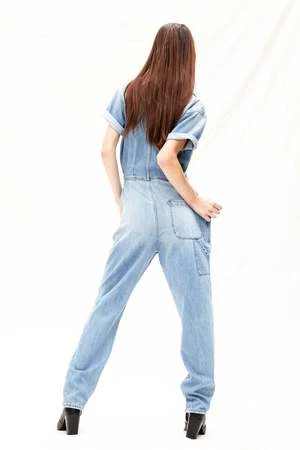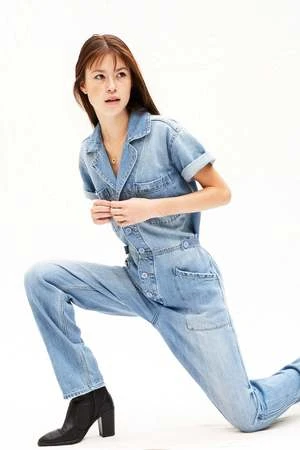 The Grover jumpsuit has adjustable straps and a front button closure.