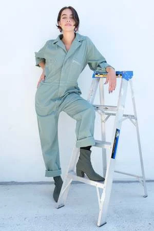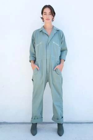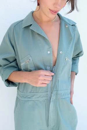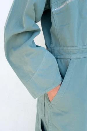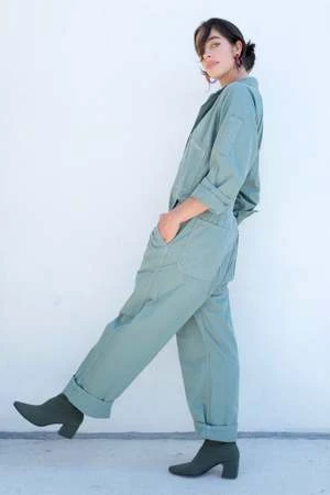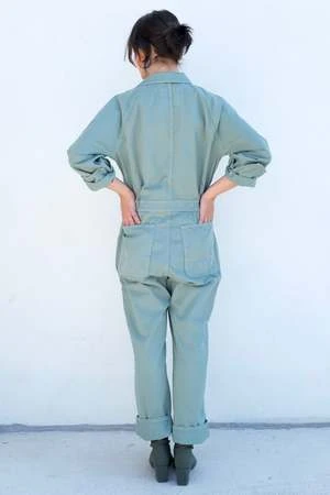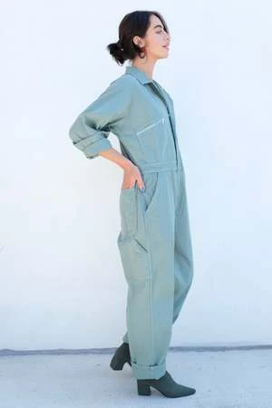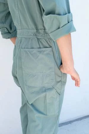 An oversized coverall jumpsuit in a soft Organic Chino Twill. Features an elasticized waistband at the back and concealed snap button closure.