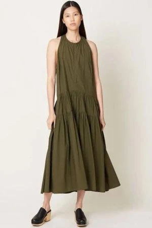 Misty Dress in olive. Zip-front tiered maxi dress in brushstroke print on cotton poplin with a high neck, Y-back and voluminous skirt.