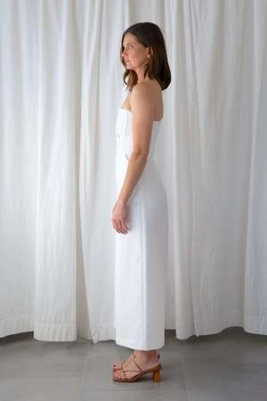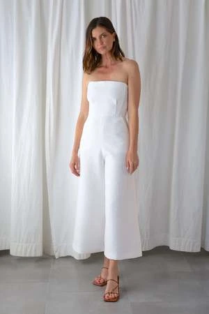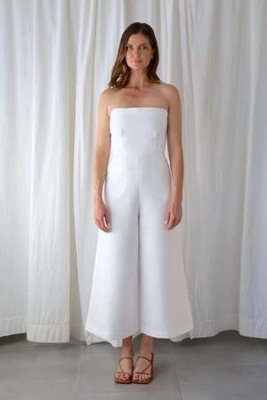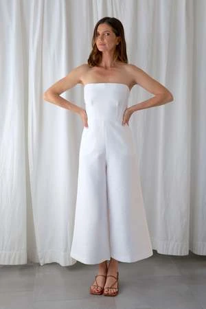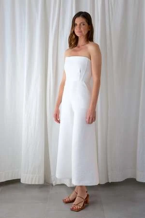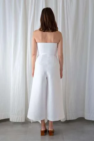 Strapless, high-waisted jumpsuit in white with a wide, cropped leg in Italian foam jacquard. Features a structured, fitted bodice with flattering darts and lightweight boning. Side slip pockets and an invisible zipper at the side.