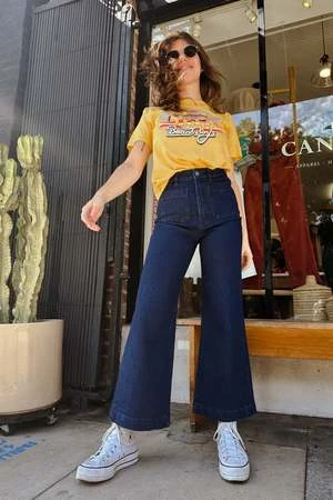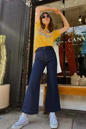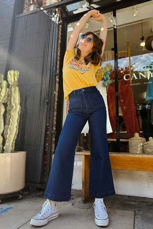 Calling all retro babes, these pants have your name on them! These are perfect to wear to the local farmers market or just boppin around town. Pair them with a white tee or a printed blouse to keep the retro vibes flowing. The Sailor Jean is reminiscent of classic 1970’s styles, inspired by icons like Jane Birkin and perfected for everyday wear.