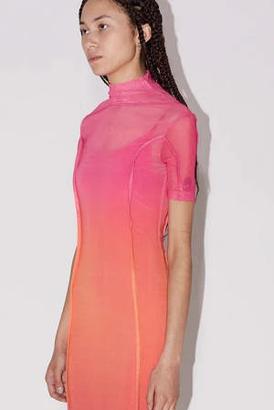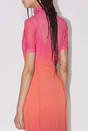 Fitted gradient mesh dress with high raised neck, 1/3 sleeves, french seam on body and detachable slip dress. Mid calf length.