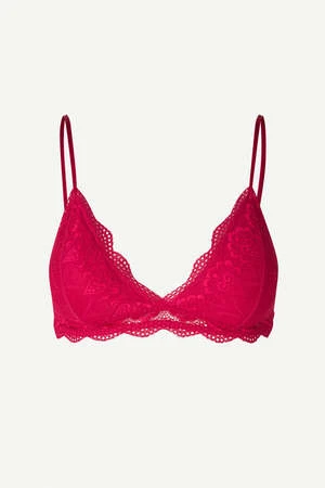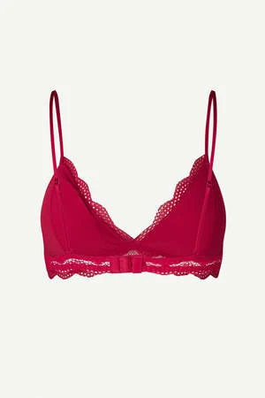 Triangle bra with removable soft padding. Patterned lace fabric with scalloped border. Adjustable shoulder straps and hook and bar fastening.