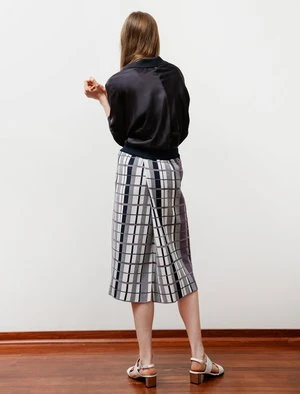 A classic silhouette, cut from a comfortable cotton knit with just the right amount of stretch. Finished with a foldover pleat and small slit in the back, as well as an elasticated waist, this skirt is fitted throughout in an oversized navy, purple and white check.