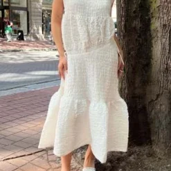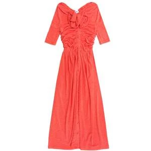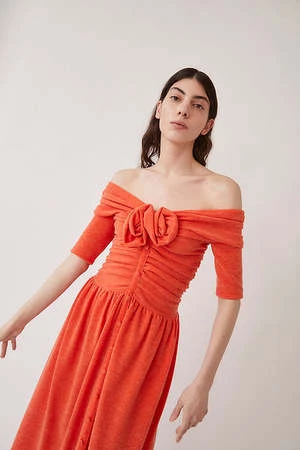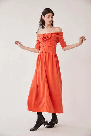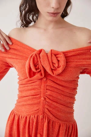 An off the shoulder fitted dress with flower detail at neckline. Ruched waist and lined button detail.