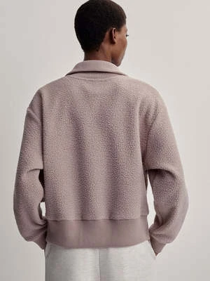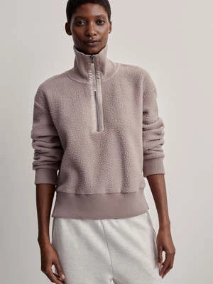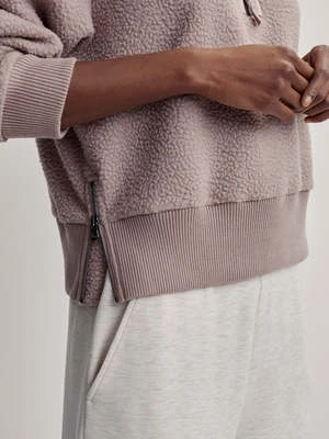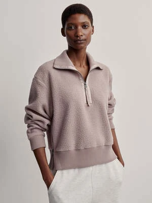 Spotlighting Varley’s 100% Recycled Plush Borg Fleece, this style is cut with a half-zip collar, ribbed cuffs, and loose-fit sleeves. Trademark side zip detailing and a luxe sateen trim elevate the design.