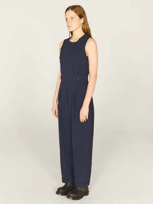 The Jojo Seersucker Jumpsuit in Indigo from YMC is a sleeveless jumpsuit cut from a heavy duty cotton seersucker. Featuring front waist pleats and side pockets. Crafted from cotton seersucker, the jumpsuit has invisible zip fastening at the back and side pockets.